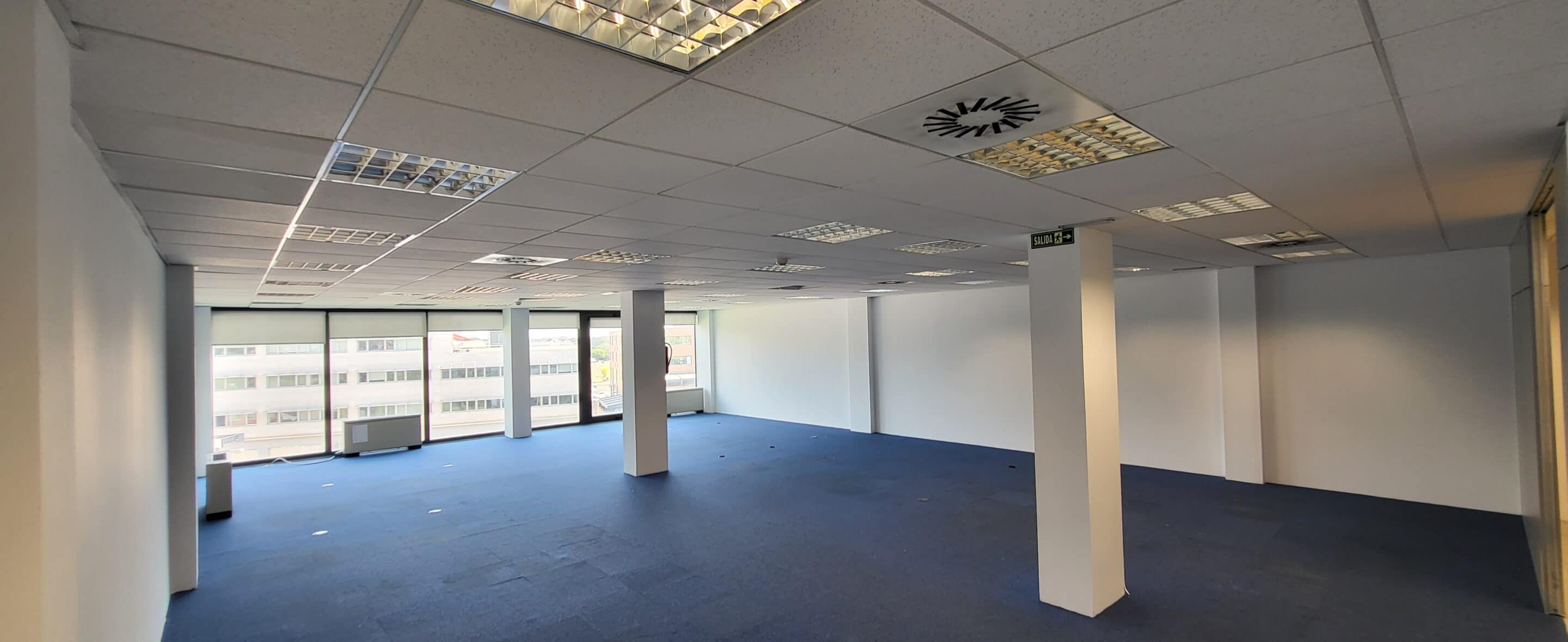 Alquiler del módulo 34. La oficina dispone de la instalación eléctrica tanto de iluminación como de fuerza realizada y lista para su uso. No requiere contratación con compañía eléctrica. También está realizada la instalación de clima. Las ventanas disponen de cortinas tipo Screen. Dispone de suelo técnico cubierto de moqueta y vinilo. Tiene dos zonas separadas por una mampra que puede retirarse.